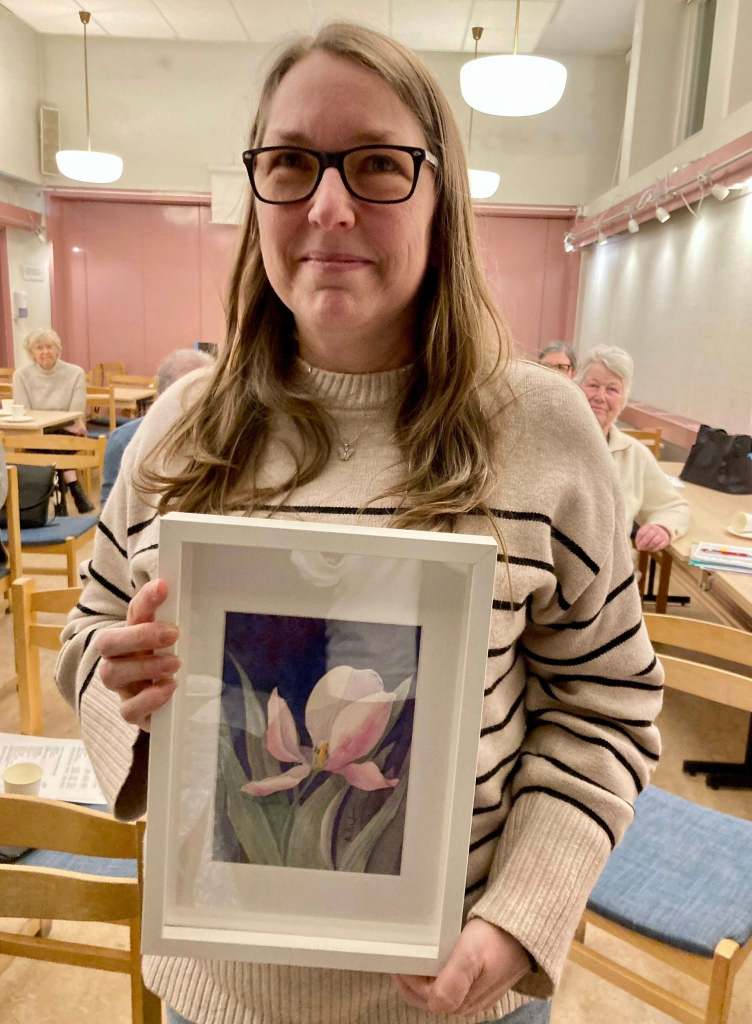 En av kvällens vinnare i närvarolotteriet, Gabrielle van der Wal som vann en akvarell av Anna Wolf.