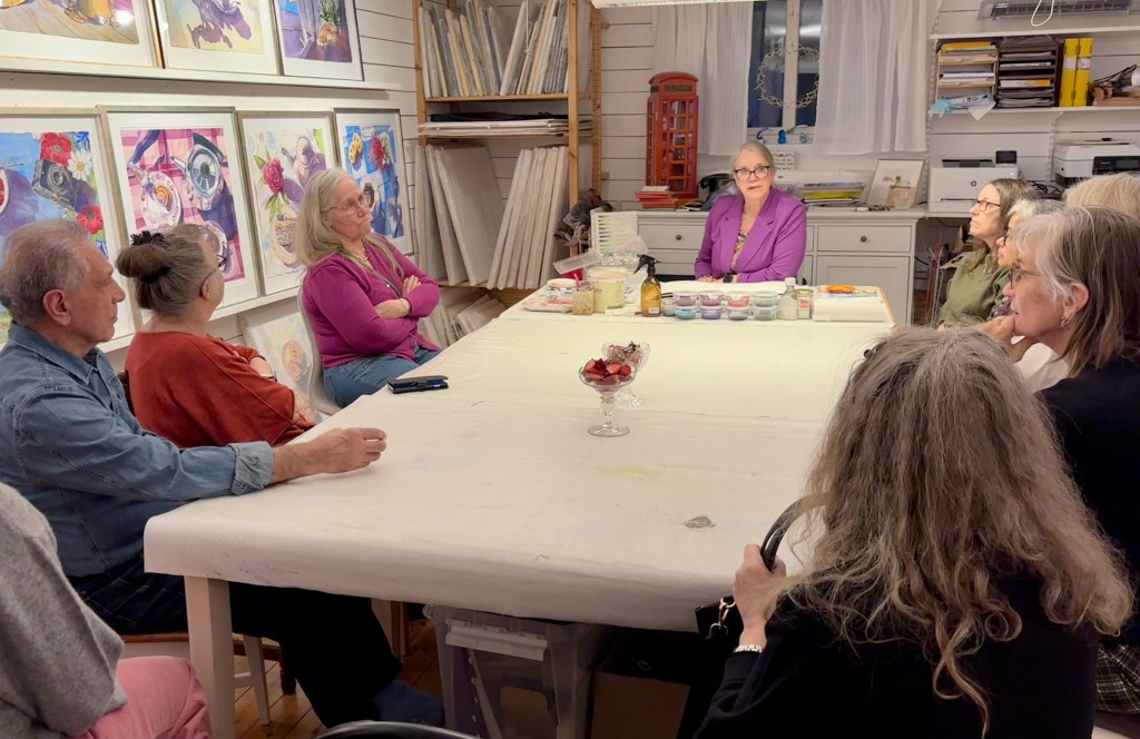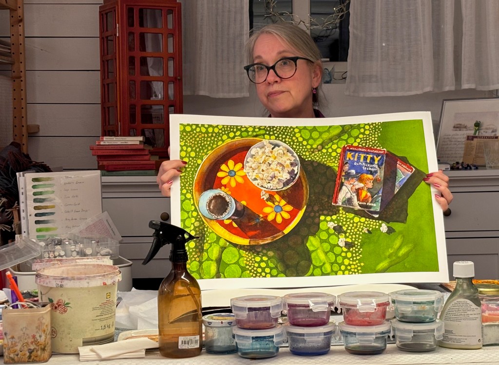 I veckan bjöds det på trevligt ateljébesök hos Tina Thagesson i Spånga för 10 av HVKs medlemmar. Vi bjöds på fika, konstvisning och trevliga samtal om akvarell, inspiration och konstnärsskap. Inköpsgruppen köpte även ett fint tryck och två brickor till årets utlottning. Läs mer om Tina och hennes konst på hennes sociala medier. Facebook och Instagram